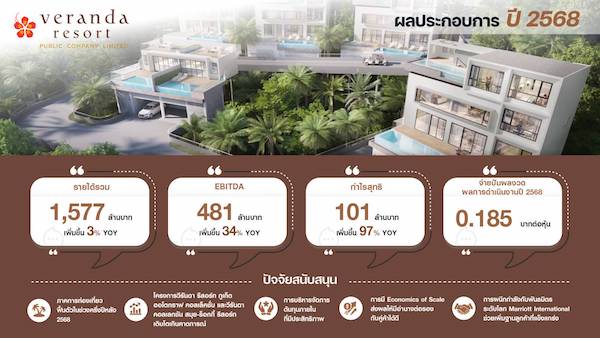 ส่วนภาพรวมผลการดำเนินงานตลอดปี 2568 VRANDA มีรายได้รวมทั้งสิ้น 1,577 ล้านบาท เติบโต 3% โดยรายได้จากกลุ่มธุรกิจโรงแรมยังคงเป็นฟันเฟืองหลักที่ 1,507 ล้านบาท เติบโต 20% ส่งผลให้ EBITDA ทั้งปีพุ่งแตะ 481 ล้านบาท เติบโตอย่างโดดเด่น 34% และสามารถทำกำไรสุทธิทั้งปีถึง 101 ล้านบาท เพิ่มขึ้น 97% เมื่อเทียบกับปีก่อน สะท้อนถึงความแข็งแกร่งในการดำเนินงาน การบริหารจัดการต้นทุนที่มีประสิทธิภาพ และการฟื้นตัวของพอร์ตโฟลิโอโรงแรมในเครือ