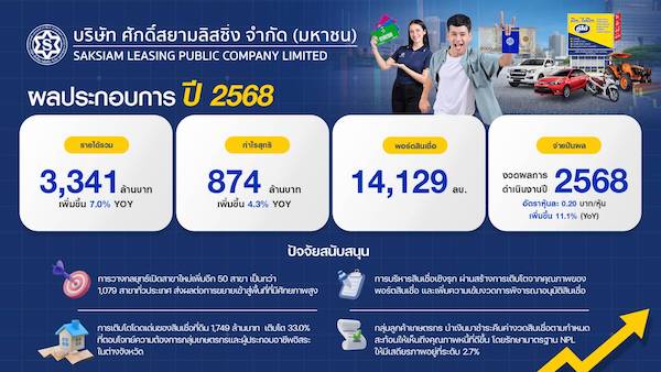 ผลการดำเนินงานปี 2568 (มกราคม-ธันวาคม) บริษัท ศักดิ์สยามลิสซิ่ง จำกัด (มหาชน) (SAK) ประสบความสำเร็จอย่างสูง ทำรายได้รวม 3,341 ล้านบาท เติบโต 7.0% เมื่อเทียบกับปีก่อน และมีกำไรสุทธิ 874 ล้านบาท เติบโต 4.3% เมื่อเทียบกับปีก่อน โดยมีปัจจัยจากการวางกลยุทธ์เปิดสาขาใหม่เพิ่มขึ้นอีก 50 สาขา เป็นกว่า 1,079 สาขาทั่วประเทศ ที่ส่งผลต่อการขยายเข้าสู่พื้นที่ที่มีศักยภาพสูง ช่วยทำให้ SAK เข้าถึงฐานลูกค้าเพิ่มขึ้น แม้ว่าผลการดำเนินงานไตรมาส 4/2568 (ตุลาคม-ธันวาคม 2568) ทำรายได้รวม 813 ล้านบาท ลดลง 3.5% เมื่อเทียบกับไตรมาสก่อน และมีกำไรสุทธิ 212 ล้านบาท ลดลง 5.4% เมื่อเทียบกับไตรมาสก่อน ซึ่งเป็นไปตามปัจจัยทางฤดูกาล โดยเฉพาะในกลุ่มลูกค้าเกษตรกรที่เข้าสู่ช่วงฤดูเก็บเกี่ยวผลผลิต และนำเงินมาชำระคืนค่างวดสินเชื่อตามกำหนด ซึ่งสะท้อนให้เห็นถึงคุณภาพหนี้ที่ดีขึ้น
